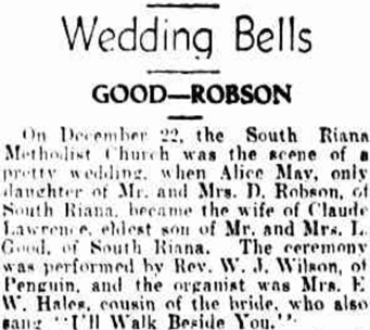 Lawrence GOOD and Nellie Elizabeth WALKER who were married in 1920 at Burnie.
